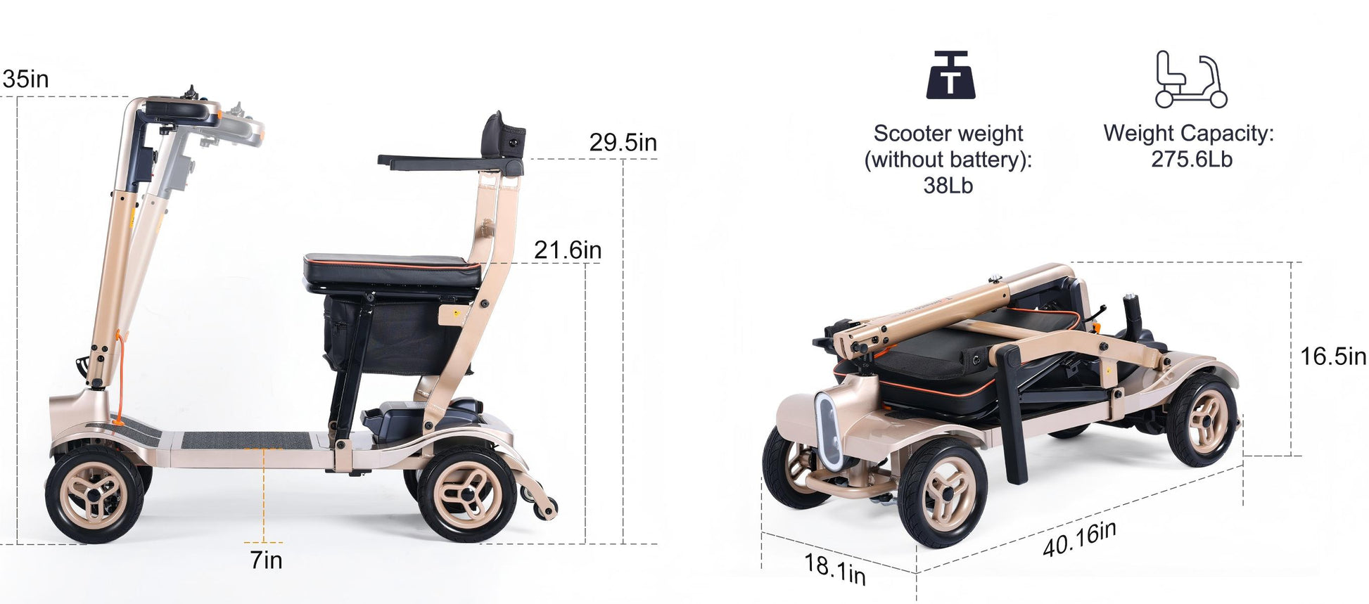 The electric 4 wheel mobility scooters folds easily in two steps, saving space and making it convenient to carry while traveling. The lightweight 4 wheel electric scooter for adults weighs only 38.36 lbs but can support up to 275.6 lbs, making it an ideal choice for users with mobility issues.