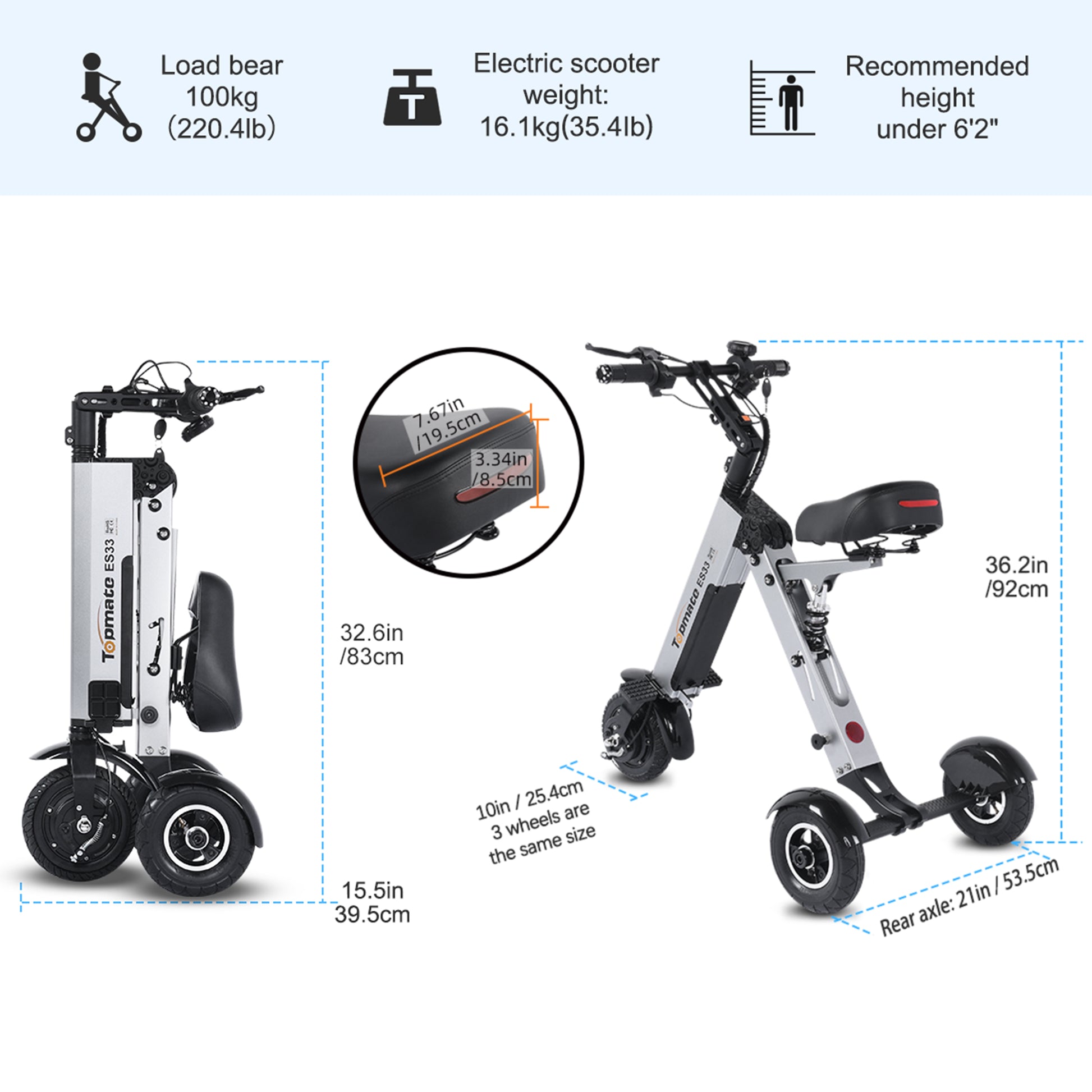 TopMate ES33 Electric Scooter for Adults is perfect for frequent travelers or those with mobility challenges. This 3-wheel electric tricycle offers unbeatable convenience and comfort for short trips. With smaller tires and a lower center of gravity than the ES35, it's better suited for those who need a sense of handling and stability. Its foldable design makes it easy to store and transport, catering to the needs of today's urban commuters. Ideal for adults facing walking difficulties, this electric trike provides a stable and secure riding experience, making it a reliable companion for navigating through city streets or commuting to work. Additionally, its travel-friendly feature includes a detachable lithium battery, allowing you to carry it on airplanes. Enjoy the freedom of mobility with the TopMate ES33 Mobility Scooter.